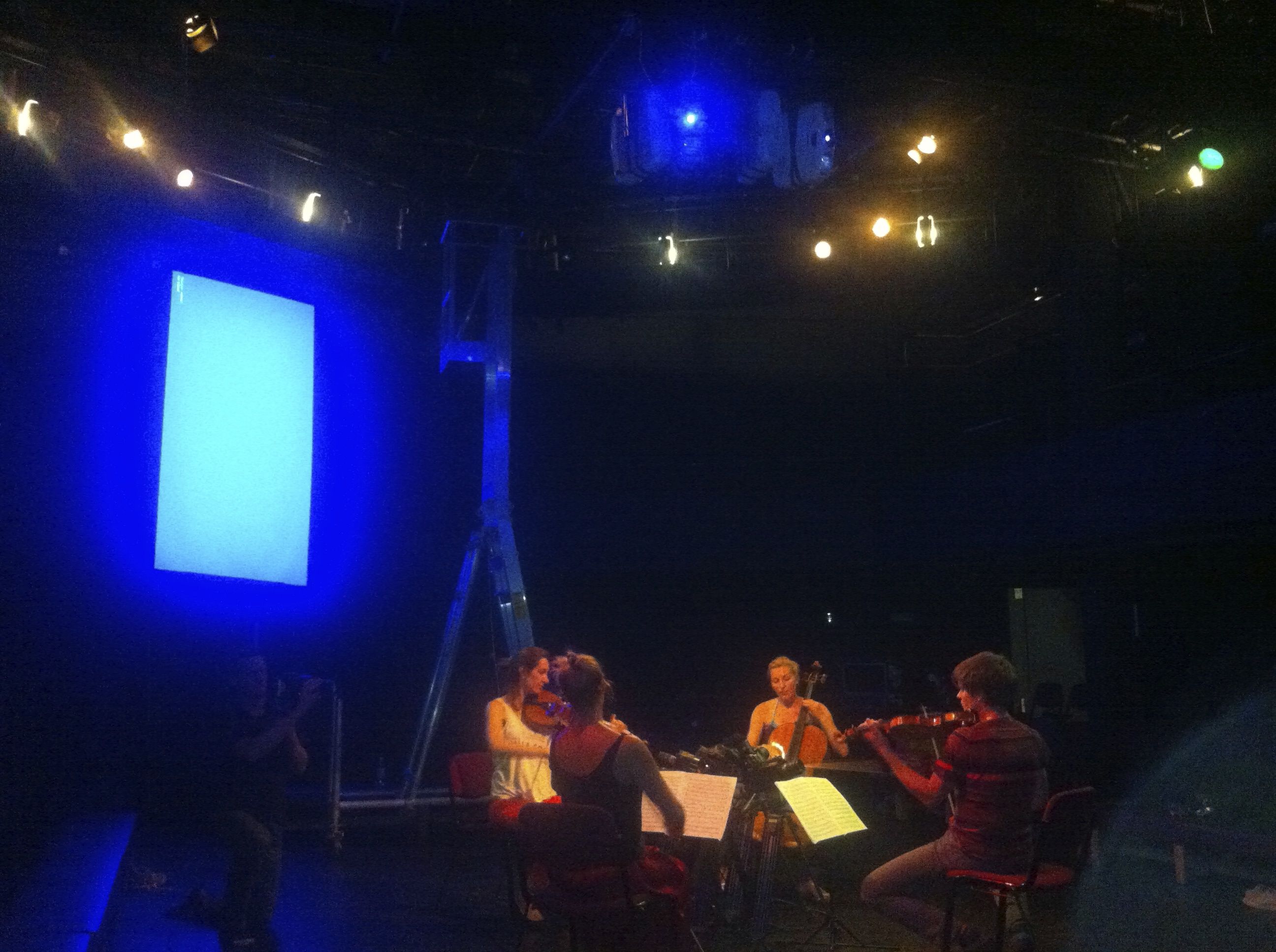 Looking back on the experience, I am delighted with what we achieved in such a short time. It was a privilege to work with such wonderful musicians, Jonathan James was a delight, as was everyone at the Old Vic, and my partners on the film and vj-ing front did really well. By the end of it we had quite a team from UWE and beyond: Michael Sides, James Gates, Sean Gulliford, Rob Jewitt, Joe Haines, Jack Offard, Rob Gordon and Gustavo Barbaroso. Thanks to all. I hope we can work together again and experiment some more. In terms of how to judge it’s success, my view is that it was never going to be to everyone’s taste, given the already intimate nature of the space and intensity of the music itself. My judgement is also that for those already sitting up close and personal to the musicians, the visuals were on balance a distraction. I feel that this issue of seating and placement of screens would need further thought in any future experiments.
